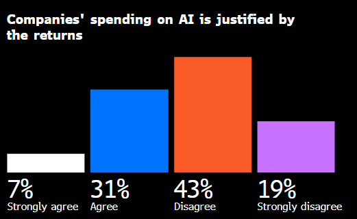 然而,几乎大致同样多的受访者表示,企业在 AI 上的花费与其回报并不相称。这种信念的裂痕,恰恰反映了市场在高歌猛进背后的深层焦虑——「AI 军备竞赛」 的成本可能远超短期收益。
