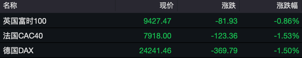 欧洲三大股指收盘也全线下跌,德国 DAX 指数跌 1.5%,法国 CAC40 指数跌 1.53%,英国富时 100 指数跌 0.86%。本周,德国 DAX 指数跌 0.56%,法国 CAC40 指数跌 2.02%,英国富时 100 指数跌 0.67%。
