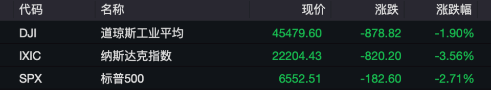 截至收盘,美国三大股指全线收跌,道琼斯工业指数跌 1.9% 报 45479.6 点,下跌近 900 点,标普 500 指数跌 2.71% 报 6552.51 点,纳斯达克指数跌 3.56% 报 22204.43 点。本周,道琼斯工业指数跌 2.73%,标普 500 指数跌 2.43%,纳斯达克指数跌 2.53%。
