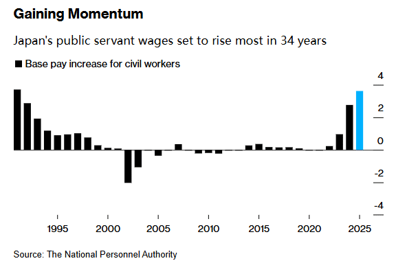 日本公务员即将获得 34 年来最大幅度的加薪,此举有望进一步强化日本央行长期以来所追求的薪资与物价增长的良性循环,这也是该行继续收紧货币政策的先决条件。