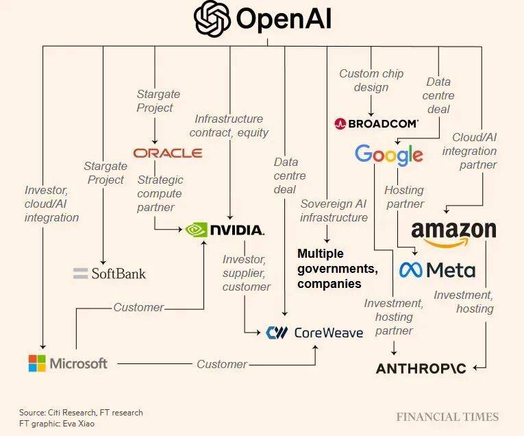 英伟达投 1000 亿美元给 OpenAI 建 AI 基础设施,OpenAI 再用这钱去买英伟达的芯片;xAI 从英伟达拿钱,再去买英伟达的处理器;OpenAI 几年内从 AMD 买 60 亿瓦 (6 gigawatts)芯片,再用极低作价买 AMD 股票。