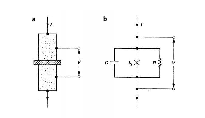 图 2(a) 是一个电流偏置的约瑟夫森结示意图,图中的散点阴影区表示超导体,中间的斜线阴影区则表示薄的绝缘层。(b) 是它的等效电路示意图,一个实际的约瑟夫森结可以表示为一个电容 c、一个理想的约瑟夫森结,以及一个电阻的并联结构。在零电压状态,这个电阻可以忽略。