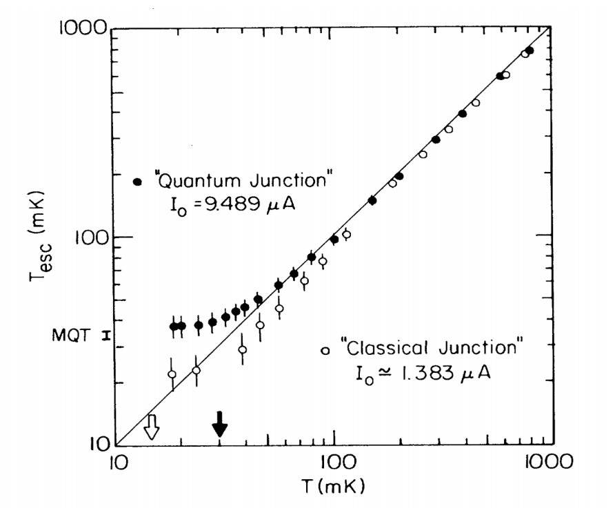 在 1980 年代早期,就已经有不同研究组在电流偏置的约瑟夫森结中寻找宏观量子隧穿的证据。测量的方法是通过逐渐改变偏置电流,测量约瑟夫森结从零电压态向有阻态 「逃逸」 的概率。随着温度的逐渐降低,这一逃逸率应该会逐渐偏离热激发逃逸率,而趋于一个稳定值,即进入 「量子区域」。但这个实验存在一个问题,那就是即便你发现了这种偏离,该如何证明它不是由于其他噪声,比如说周围更热的物体的黑体辐射造成的?
