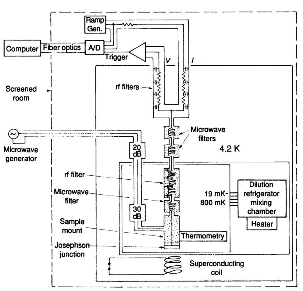图 3 克拉克、德沃雷和马蒂尼斯的实验装置。实验是在一台稀释制冷机中进行的,约瑟夫森结安装在稀释制冷机的混合室内,电流偏置线路、操控的微波线路、信号读取线路都进行了非常细致的滤波,很多滤波技术沿用至今天的超导量子计算系统中。