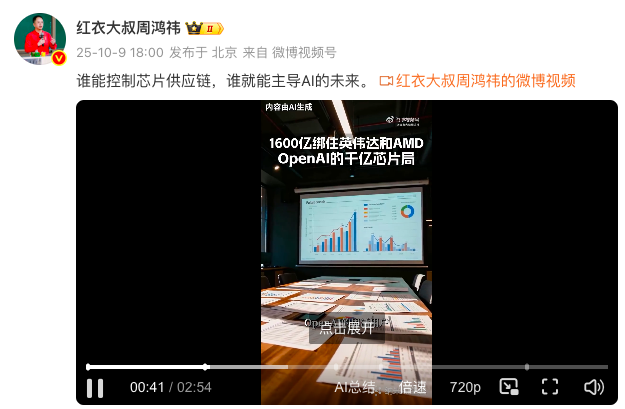 「既想要英伟达的技术壁垒,又要 AMD 的性价比,还要让两家互相咬自己坐收算力霸权的余利。更厉害的是时间把控,两家供应商的首批发货都定在 2026 年下半年,奥特曼早就打好了算盘,要是英伟达延期交货就用 AMD 的货补,要是 AMD 掉链子就马上加进英伟达的单。这就等于给两家都上了紧箍咒,谁不听话订单就全给对方。」 周鸿祎分析道,AI 行业里,算力比石油还金贵。谁能控制芯片供应链,谁就能主导 AI 的未来。而奥特曼这一步棋已经把两大供应商都绑上了自己的战车。