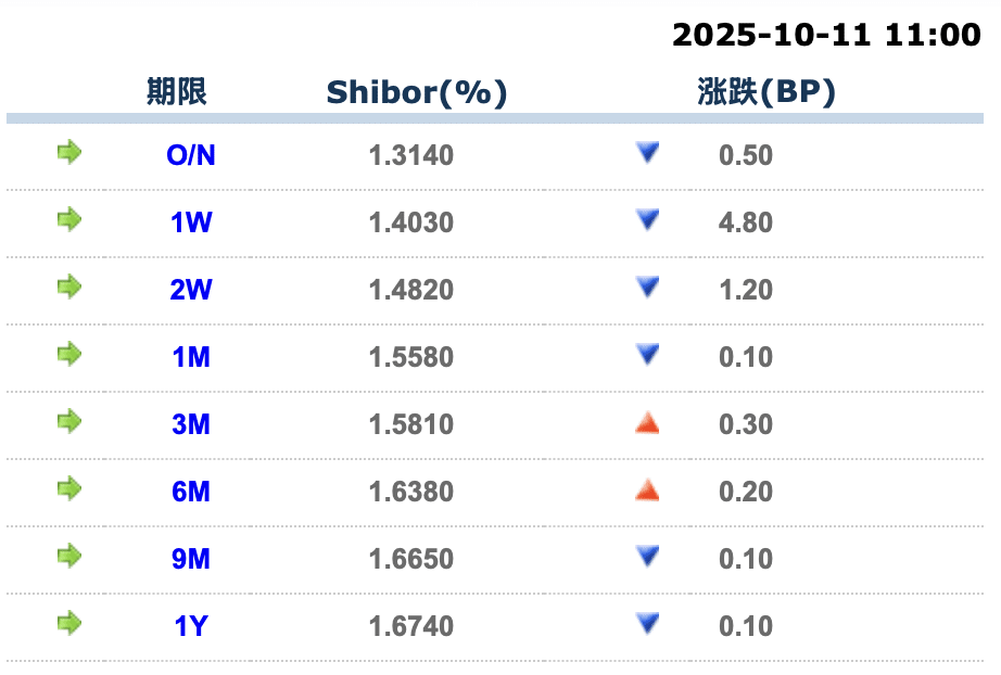 上海银行间同业拆放利率 (Shibor) 短期品种连续下跌。具体来看,隔夜 Shibor 下跌 0.50BP,报 1.3140%;7 天 Shibo 下跌 4.80BP,报 1.4030%;14 天 Shibor 下跌 1.20BP,报 1.4820%。