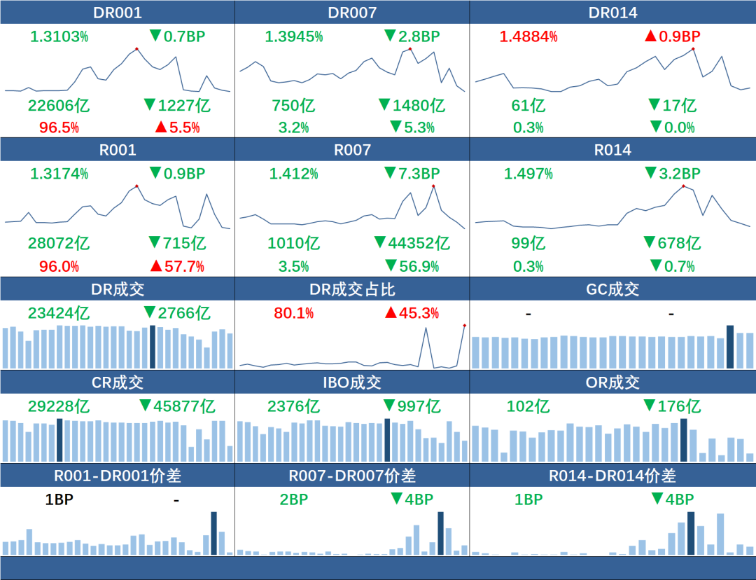 银行间质押式回购市场方面,除 DR014 外其余品种利率连续下跌。具体看,DR001、R001 加权平均利率下行 0.7BP、0.9BP,报 1.3103%、1.3174%,成交额分别减少 1227 亿元、715 亿元;DR007、R007 加权平均利率分别下行 2.8BP、7.3BP,报 1.3945%、1.412%,成交额分别减少 1480 亿元、44352 亿元;DR014、R014 加权平均利率分别上行 0.9BP、下行 3.2BP,报 1.4884%、1.497%,成交额分别减少 17 亿元、678 亿元。