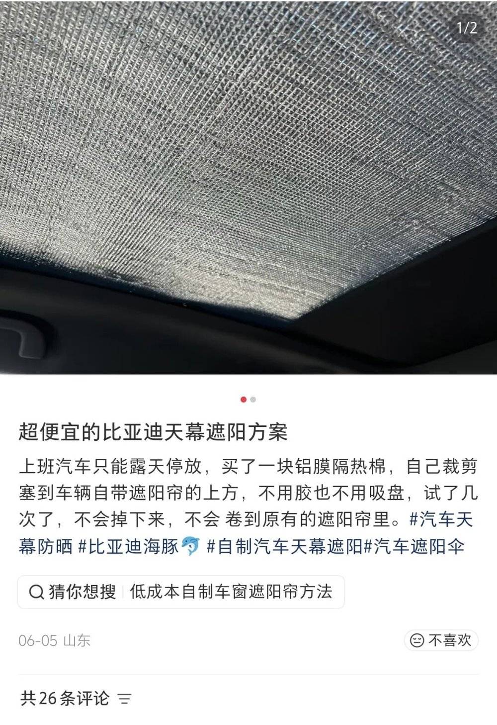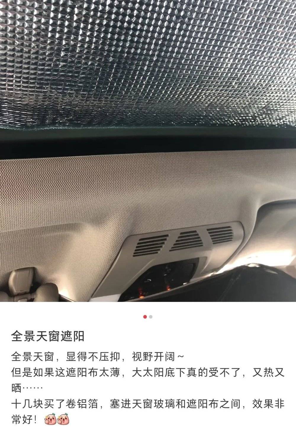 ▲社交平台上网友们分享用铝箔棉遮挡全景天幕的方案