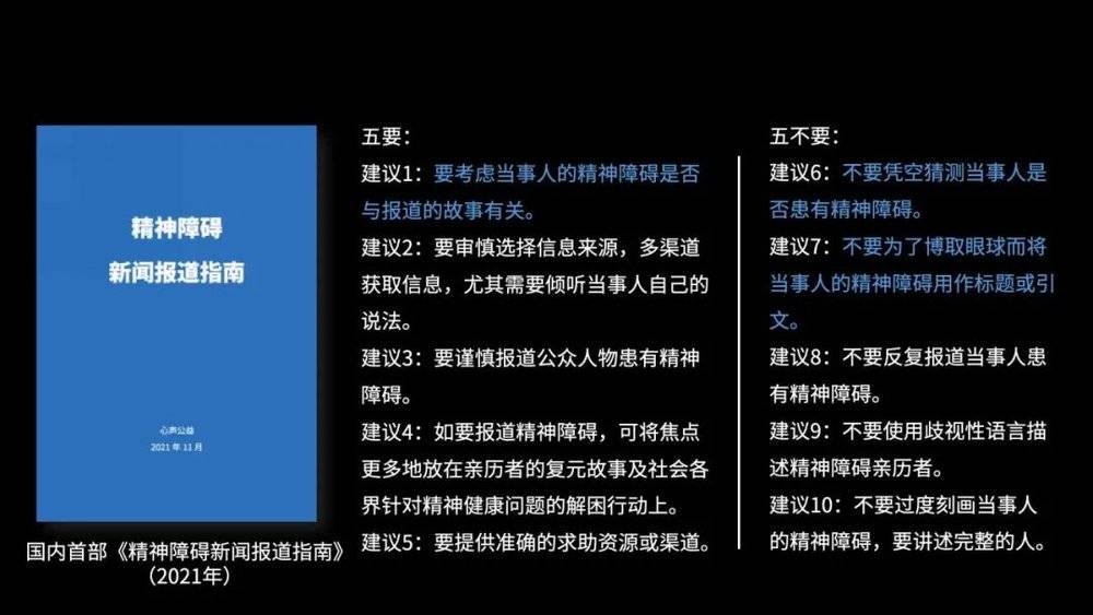 我们提出了一些建议,包括五 「要」 和五 「不要」。比如说不应该凭空地揣测某个新闻报道的当事人是不是罹患精神疾病,特别是某些犯罪事件、伤人事件。