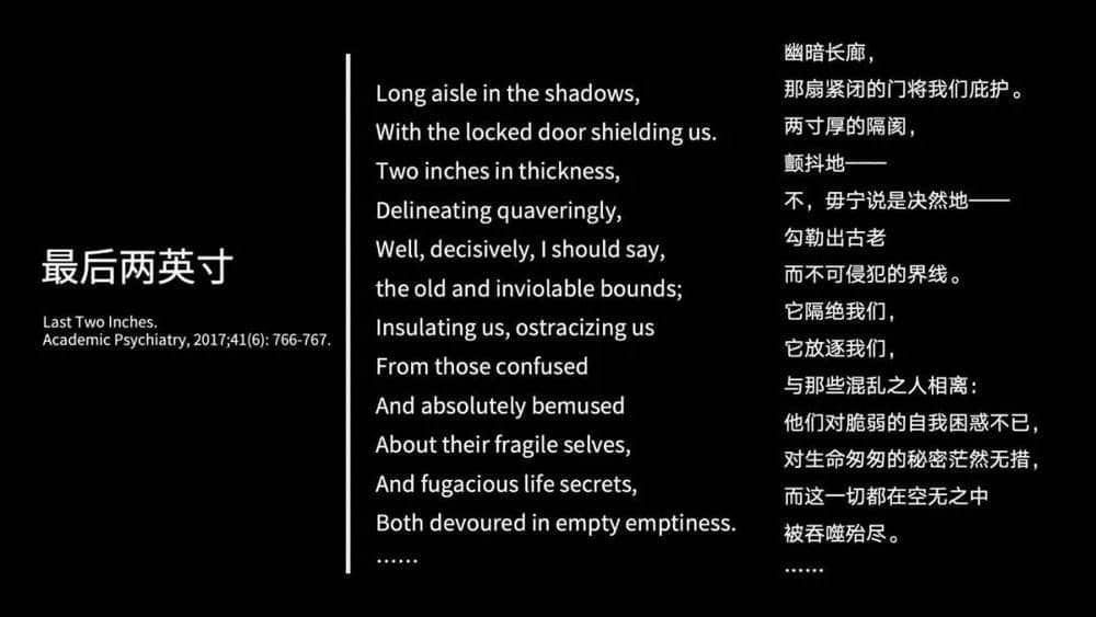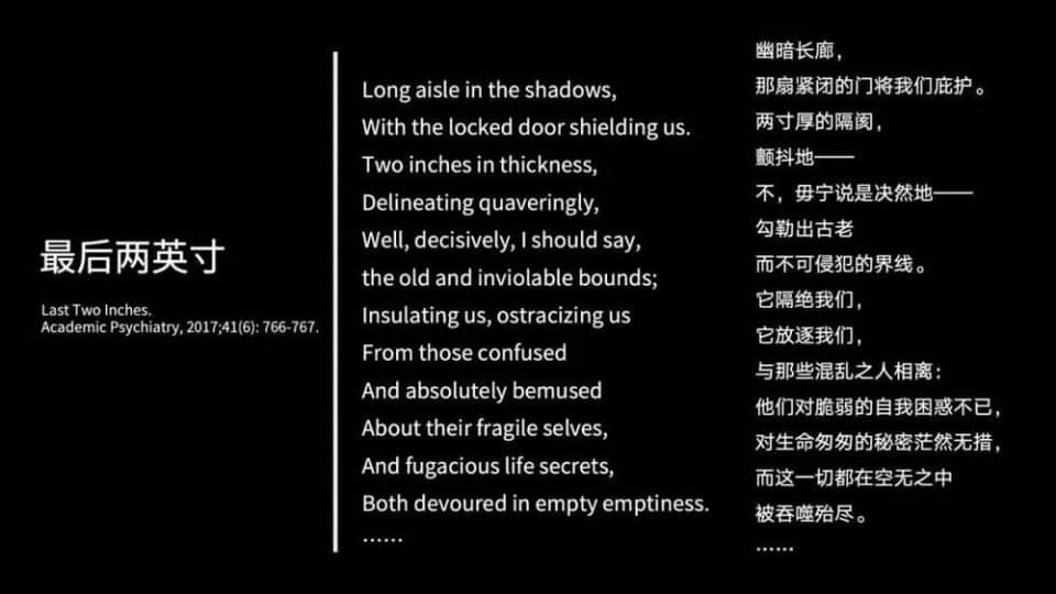 我还写了一首英文诗 《最后两英寸》 讲述这段经历。两英寸,其实就是办公室墙壁这五六公分的距离,但也隐喻着社会中,我们跟精神疾病患者的距离,看似很近,却又很远。后来,我的很多工作,都与打破这堵墙有关。
