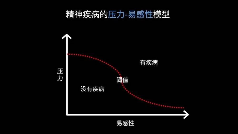 精神科临床上有一个压力-易感性模型,可以帮助解释患者为什么会发病。每个个体其实都可能罹患精神疾病,只不过每个人罹患精神疾病的风险,或者说易感性不太一样。易感性高的,罹患精神疾病的风险就更高。