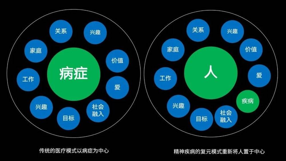 现在在国际上,我们会越来越谈到精神疾病的 「复元模式」。精神疾病的康复痊愈,或者说复元,不只是病症的痊愈,更是要从疾病所导致的病耻感中痊愈,从失业、失学的负面影响中痊愈,从梦想的破碎中痊愈。