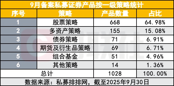 9 月备案产品在策略分布上的结构性特征,依旧清晰指向权益类资产的主导地位。数据显示,9 月备案的 1028 只产品中,股票策略产品数量高达 668 只,占比高达 64.98%;其次为多资产策略,共备案 155 只,占比 15.08%。债券策略和期货及衍生品策略紧随其后,分别为 71 只和 69 只,占比不到 7%。组合基金与其他策略则相对小众。