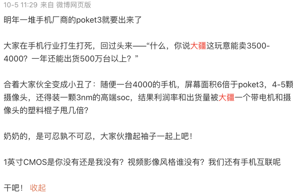 以 Pocket 3 产能初期的核心瓶颈——那块一英寸影像传感器为例,手机厂商不仅能以更具竞争力的价格采购,更能确保获得稳定且充足的供应,这恰好直击了大疆最关键的痛点。