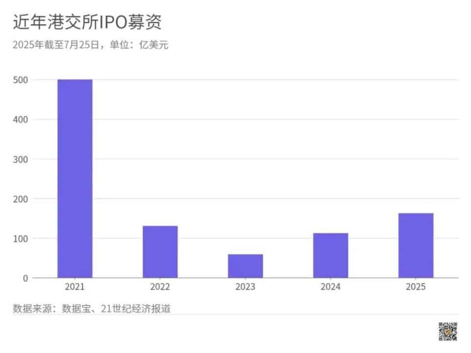 截至 7 月 25 日,2025 年已有 52 家公司登陆港股上市,港股 IPO 首发募集资金已达 1273.6 亿港元 (约合 162.74 亿美元),创 2021 年以来新高。