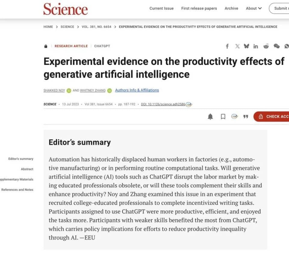 Noy,S.,&Zhang,W.(2023).Experimental evidence on the productivity effects of generative artificial intelligence.Science,381(6654),187-192.