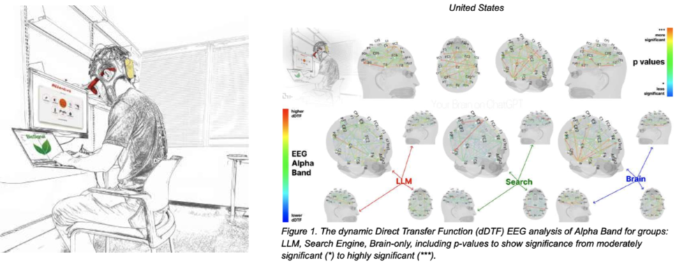 尤其值得一提的是,麻省理工学院的研究团队通过脑电图 (EEG)技术直接观测了个体的大脑,发现使用 ChatGPT 的学生组,其大脑活动水平远低于仅靠自己思考或使用搜索引擎的小组。