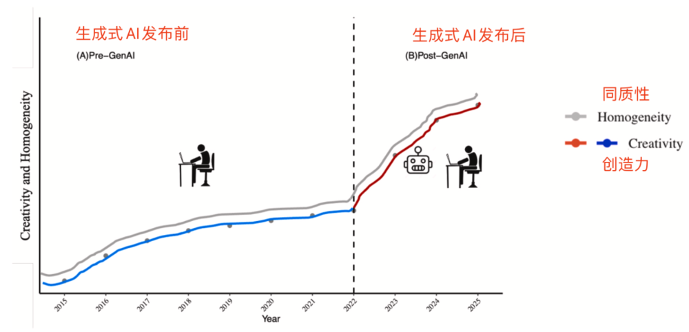 生成式 AI 发布前后学术界论文同质性和创造力结果示意图