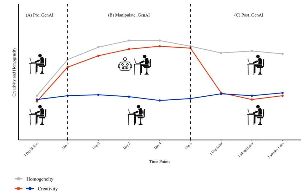 这项纵向追踪研究用直接的因果证据,证实了 AI 对个人创造力的长期影响。AI 带来的可能只是一种无法内化的 「创造力幻觉」,而它留下的思想趋同,却可能成为一道难以消除的 「创意伤痕」,长期存在于我们的认知与表达习惯之中。