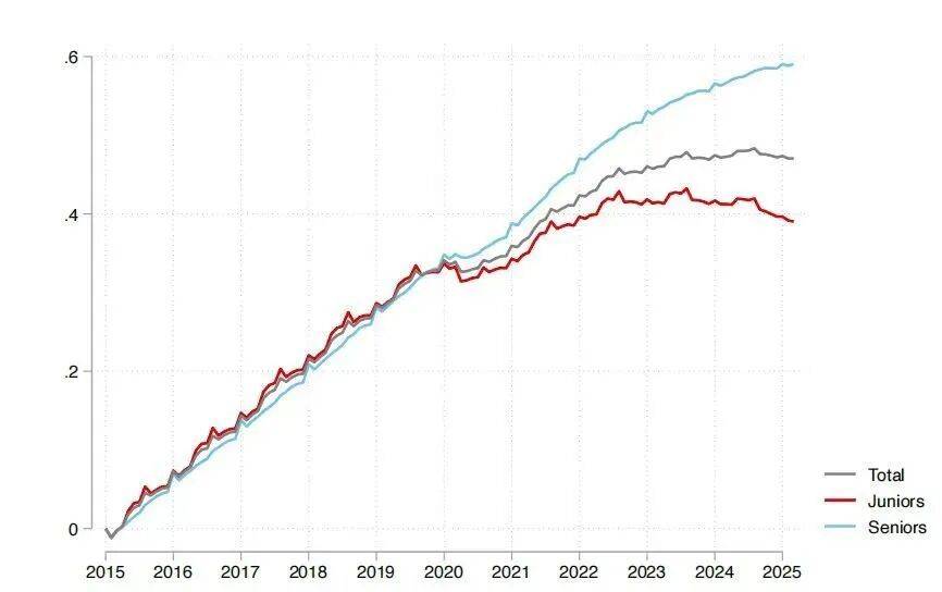 2025 年,两位哈佛大学的经济学博士,通过分析 2015 至 2025 年间覆盖超 6200 万员工、超 1.5 亿次的招聘就业数据,揭示了一个冷酷的真相:生成式 AI 正以一种 「资历偏向」 的方式重塑劳动力市场。