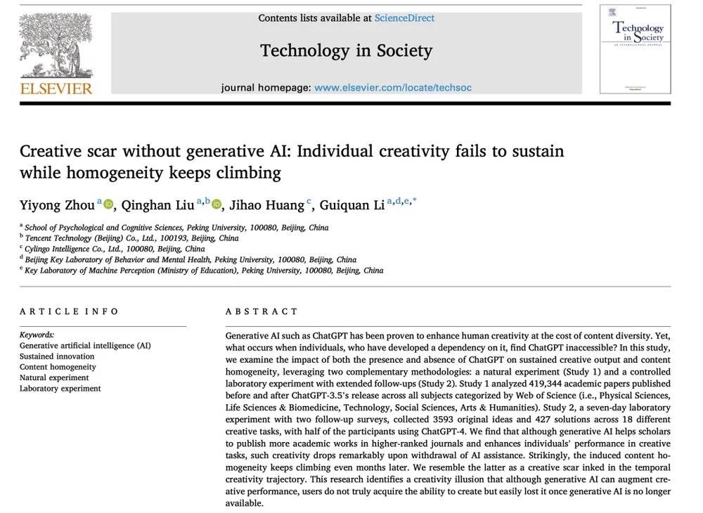 Zhou,Y.,Liu,Q.,Huang,J.,&Li,G.(2025).Creative scar without generative AI:Individual creativity fails to sustain while homogeneity keeps climbing.Technology in Society,103087.