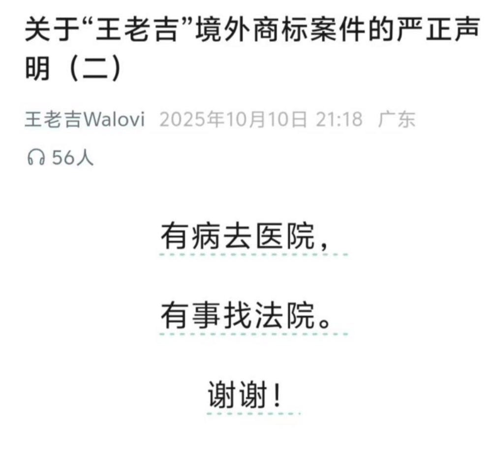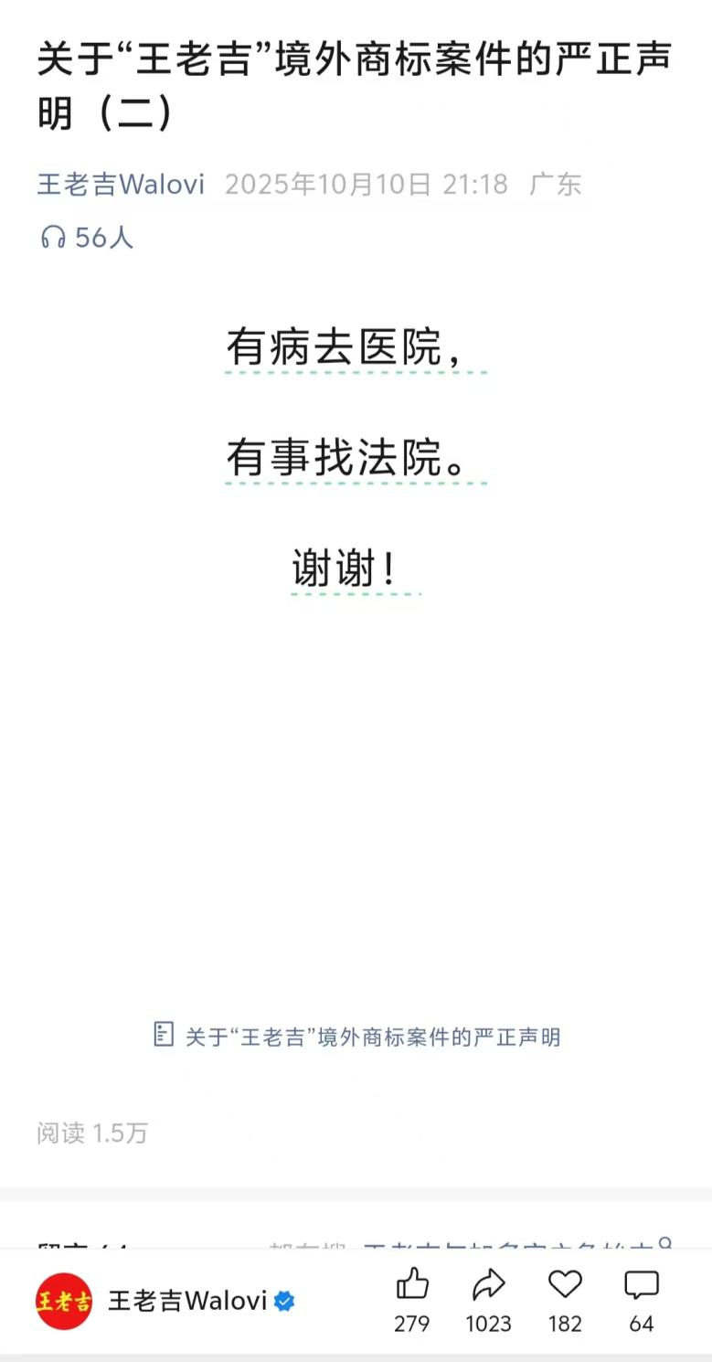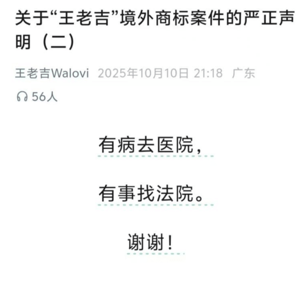 而王老吉似乎也被彻底激怒了,直接在官方渠道发布:「有病去医院,有事找法院。谢谢」。这一措辞犀利的回应,让不少网友感到诧异,甚至以为看错了账号:「揉了几次眼睛,哈哈哈哈」「我反复确认了来源……」