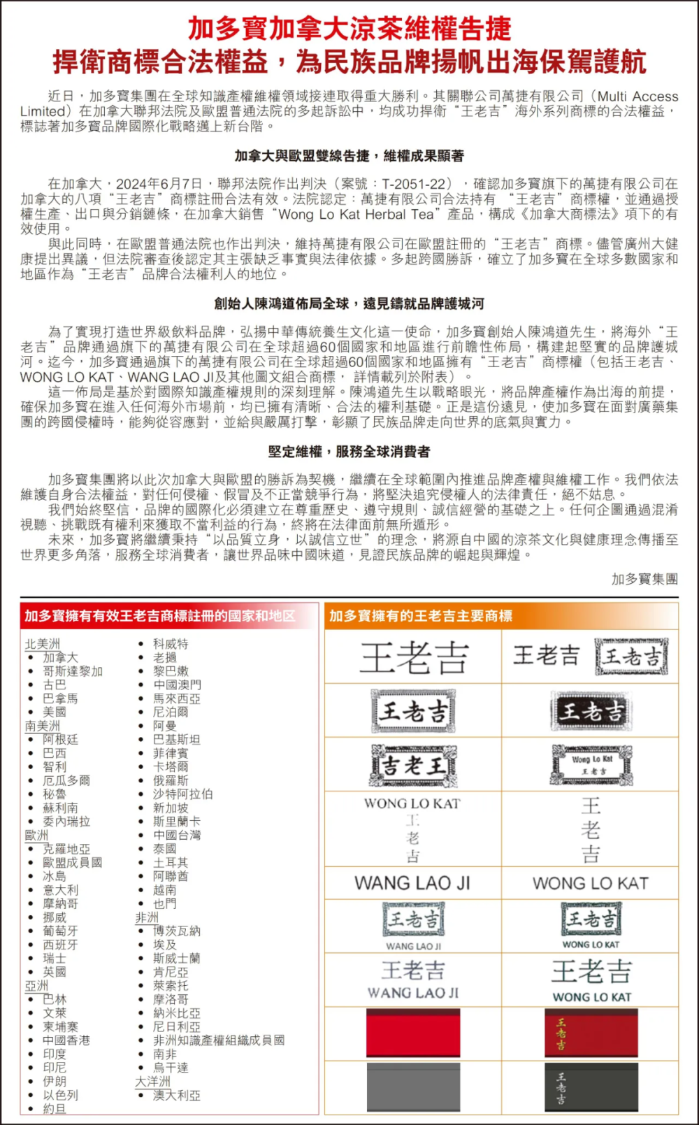 加多宝在这份声明中表示,「近日,加多宝集团在全球知识产权维权领域接连取得重大胜利。其关联公司万捷有限公司 (Multi Access Limited)在加拿大联邦法院及欧盟普通法院的多起诉讼中,均成功捍卫 『王老吉』 海外系列商标的合法权益,标志着加多宝品牌国际化战略迈上新台阶。」