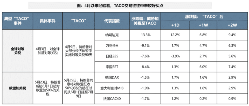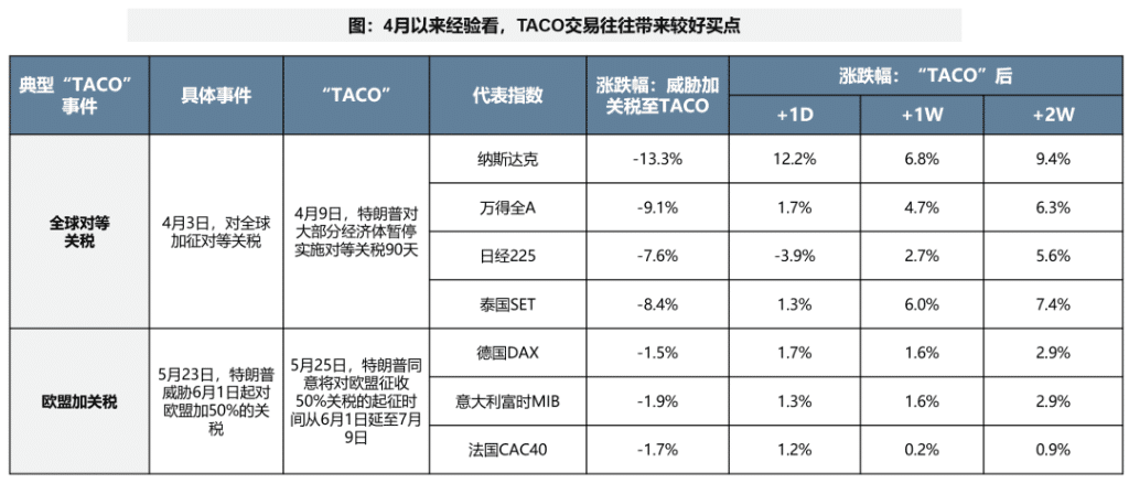 刘晨明团队写道:如果大概率是 TACO 交易,历史看短期下跌提供了买入的好时机。4 月以来,全球 TACO 交易多次出现,包括特朗普威胁加关税后不断延期、威胁开除鲍威尔但又马上反复、威胁对铜加关税但又豁免精炼铜等等。