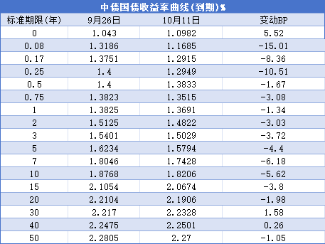 2025 年 10 月 11 日,中债国债到期收益率 1 年期、2 年期、3 年期、5 年期、7 年期、10 年期、30 年期、50 年期较 2025 年 9 月 26 日分别变动-1.34BP、-3.03BP、-3.72BP、-4.4BP、-6.18BP、-5.62BP、1.58BP、-1.05BP。
