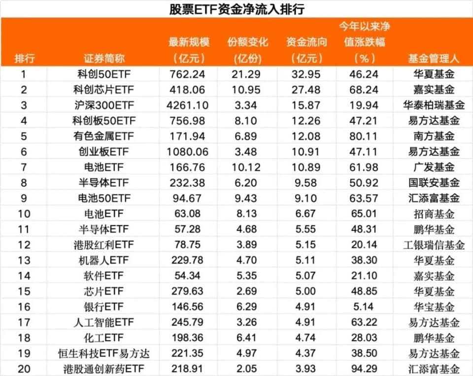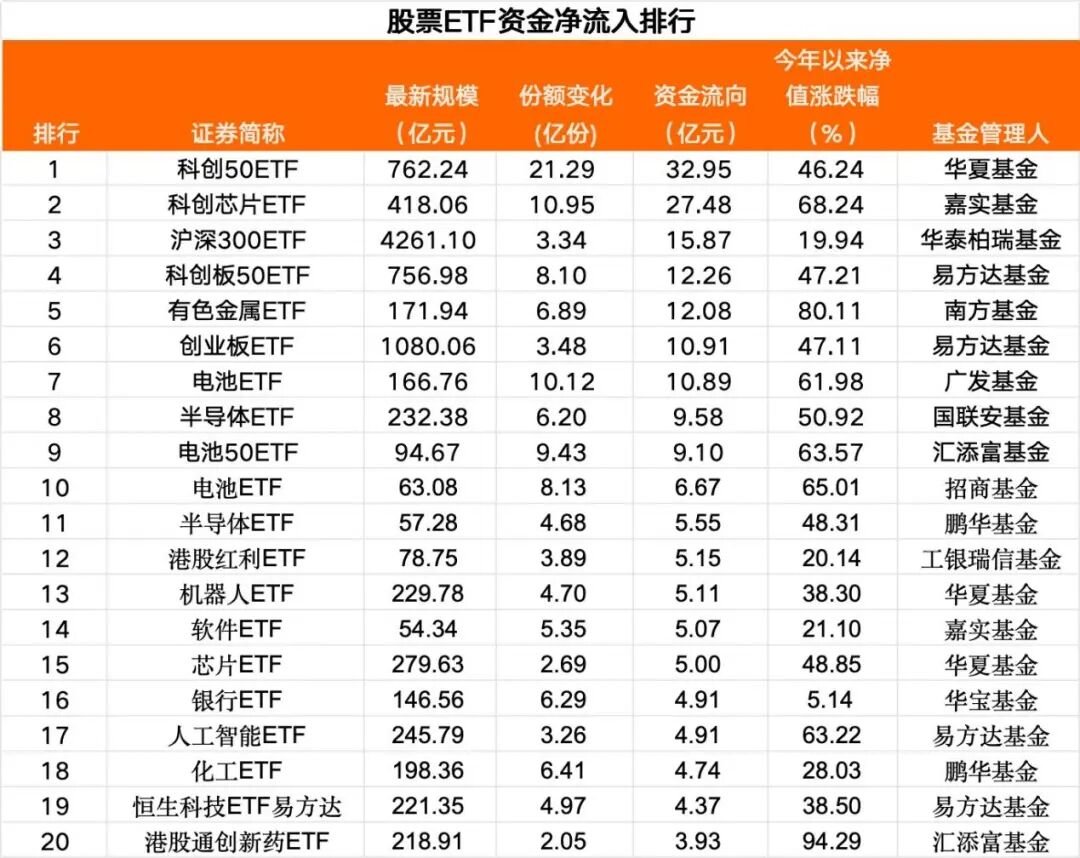 10 月以来两个交易日,股票 ETF 资金净流入已超 400 亿元,跟踪科创板指数、创业板指、沪深 300 指数等相关宽基 ETF,以及电池、芯片、有色等行业 ETF 资金净流入较多,中证 A500 等相关 ETF 则成资金 「失血」 主阵营。