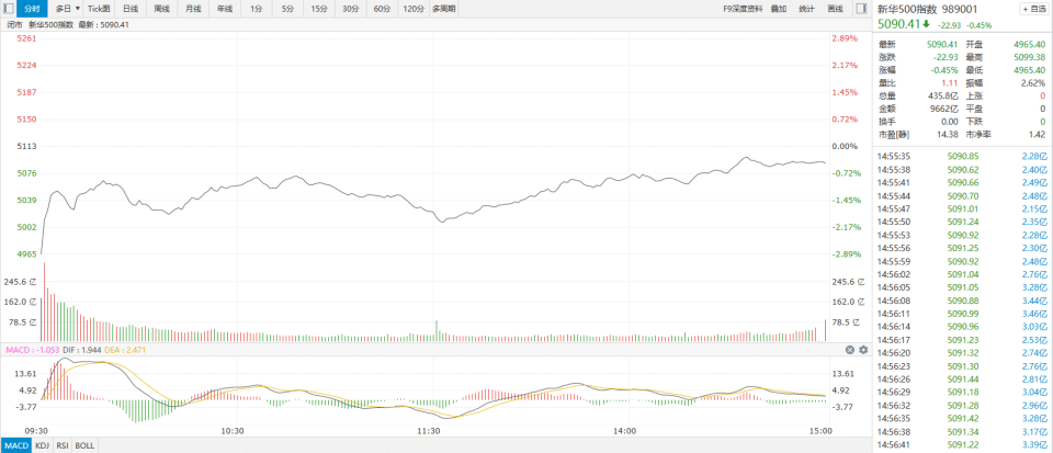 指数盘中最高触及 5099.38 点,最低触及 4965.40 点,成分股全天总成交额报 9662 亿元,总成交额较上一交易日有所缩量。