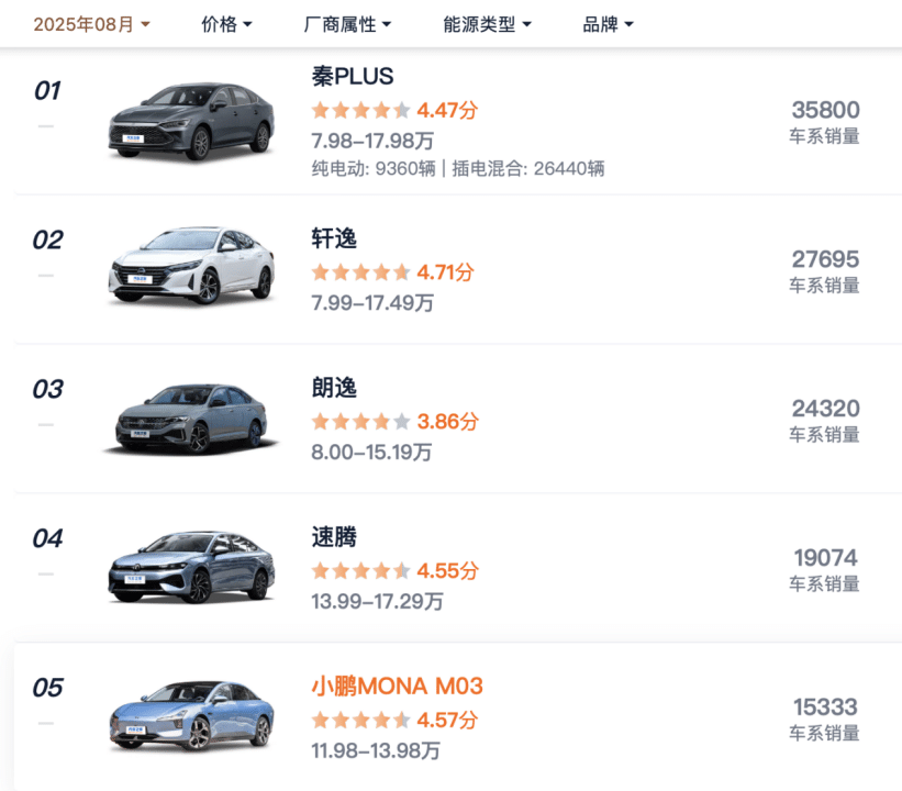 汽车之家的统计显示,今年 8 月,比亚迪秦全系销量 3.58 万辆,超过了日产轩逸、大众朗逸等经典畅销车型。降价不仅有助于比亚迪清理库存、实现产品结构调整,也为整个行业的价格战进一步加码。