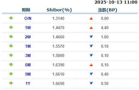 上海银行间同业拆放利率 (Shibor)7 天品种止跌上涨,隔夜和 14 天品种窄幅震荡。具体来看,隔夜 Shibor 上涨 0.00BP,报 1.3140%;7 天 Shibo 上涨 4.40BP,报 1.4470%;14 天 Shibor 下跌 1.60BP,报 1.4660%。