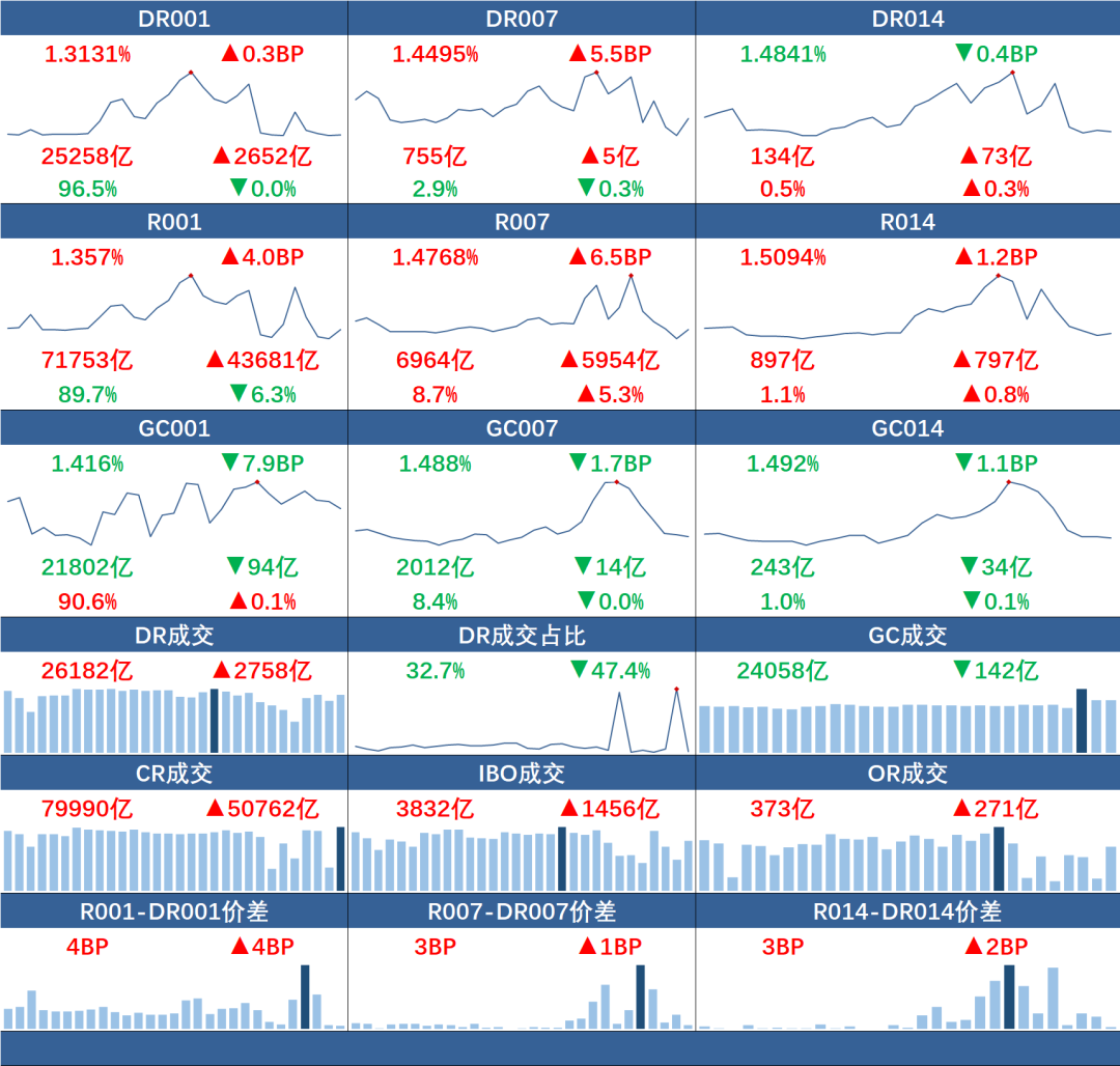 银行间质押式回购市场方面,除 DR014 品种外,其余品种均小幅上涨。具体看,DR001、R001 加权平均利率上行 0.3BP、4.0BP,报 1.3131%、1.357%,成交额分别增加 2652 亿元、43681 亿元;DR007、R007 加权平均利率分别上行 5.5BP、6.5BP,报 1.4495%、1.4768%,成交额分别增加 5 亿元、5954 亿元;DR014、R014 加权平均利率分别下行 0.4BP、上行 1.2BP,报 1.4841%、1.5094%,成交额分别增加 73 亿元、797 亿元。