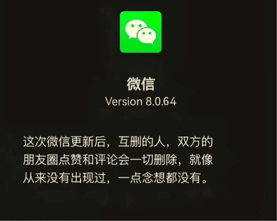 【旭才科技】10 月 13 日消息,日前,有网友在微博晒图表示,自己的微信更新到 8.0.64 后,新版本显示:这次微信更新后,互删的人,双方的朋友圈点赞和评论会一切删除,就像从来没有出现过,一点念想都没有。