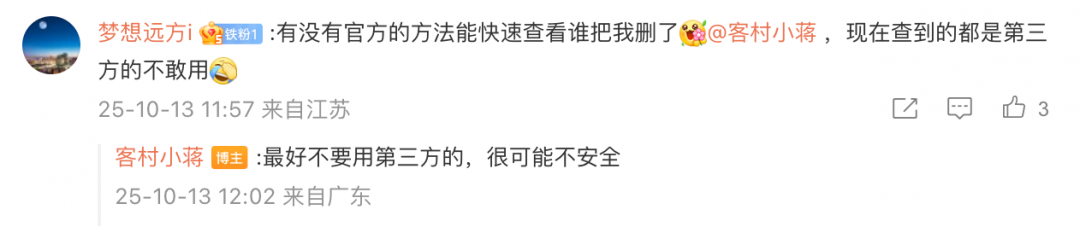 另有用户提出希望官方提供快速识别 「谁把我删了」 的功能,@客村小蒋建议称,最好不要使用第三方工具查询,因可能存在安全风险,官方也未提供此类功能。