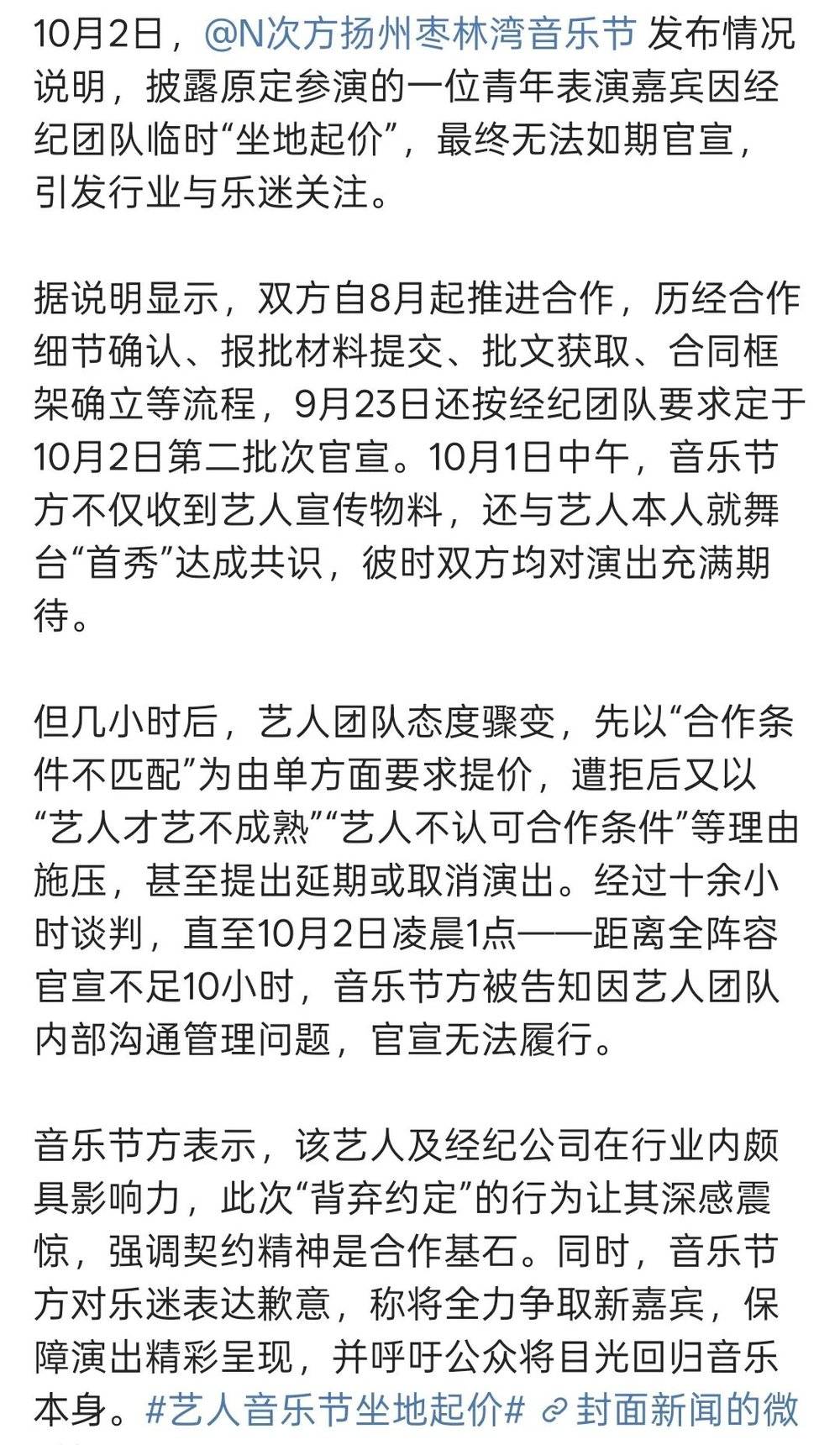 比如 10 月 2 日,高位热搜 「艺人音乐节坐地起价」 事件便是如此。据 N 次方扬州枣林音乐节发布的声明显示,某青年表演嘉宾团队在首秀演出推进约两个月后,以 「合作条件不匹配」 为由要求提升合作价格,在被拒绝后又以多理由称如若主办不同意,便只能延期或取消演出。