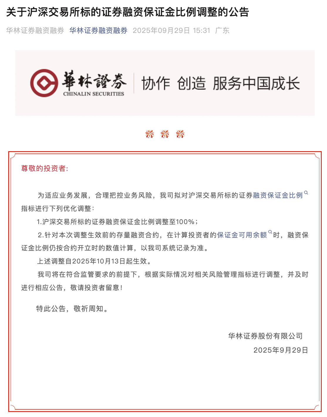 华林证券宣布自 2025 年 10 月 13 日起,将沪深交易所标的证券融资保证金比例调整至 100%,旨在适应业务发展并合理把控风险,存量融资合约则仍按原比例计算。