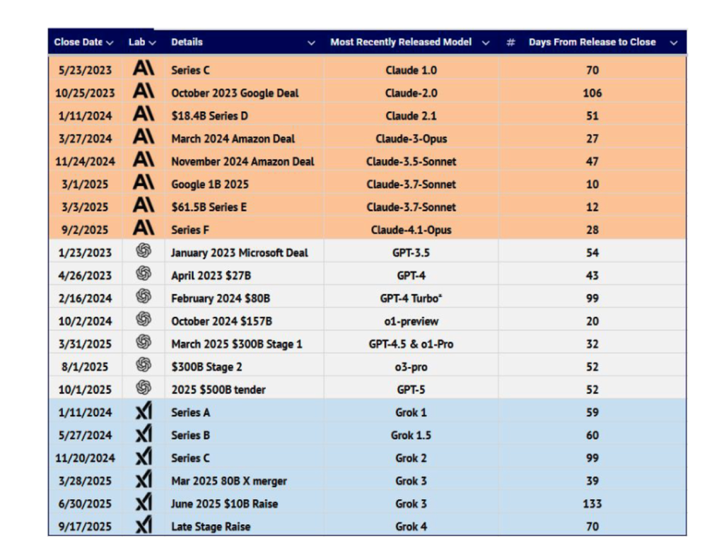报告中还提出,几家主要厂商的模型发布时间,都会在自家的融资活动之前,几乎已经成了固定的搭配了。平均而言,Anthropic 会在融资前 44 天发布一款新模型,OpenAI 会在融资前 50 天发布新模型。
