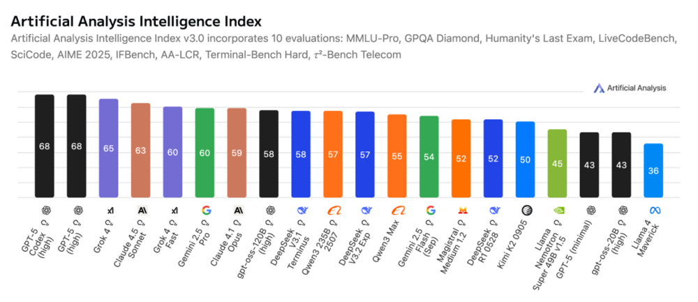 在各大模型能力测评排行榜上,OpenAI 的 GPT-5 仍然领先,但和其他家的模型差距在逐渐缩小。来自中国的 DeepSeek, Qwen 和美国的 Gemini, Claude 等模型,在关键的推理与编码能力上仅落后 GPT-5 数个百分点。