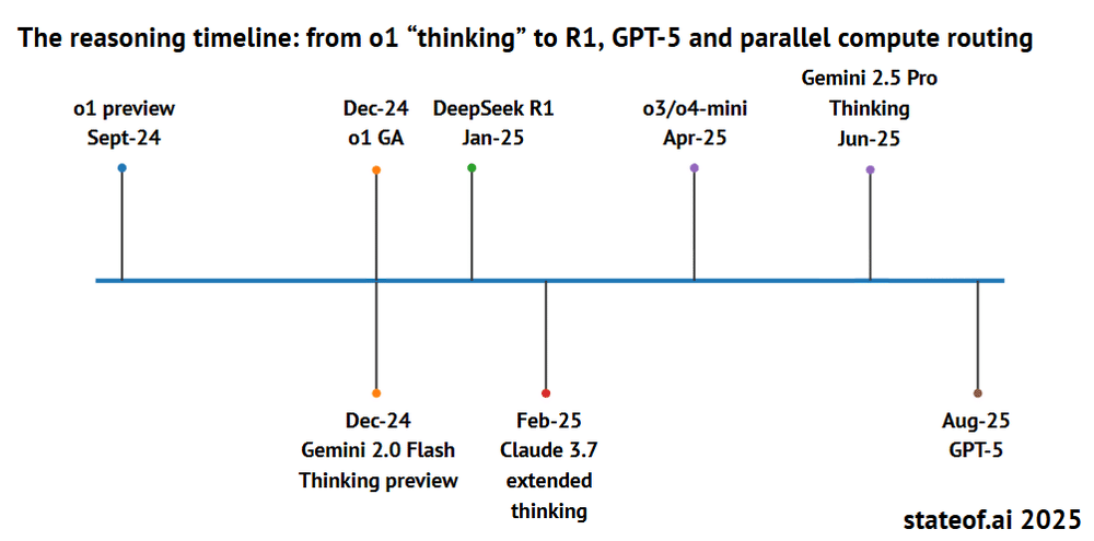 从 2024 年 9 月到 2025 年 8 月,各大公司密集发布了具备思考、推理能力的模型,如 o1、Gemini 2.0 Flash Thinking、DeepSeek R1、Claude 3.7 extended thinking 等。