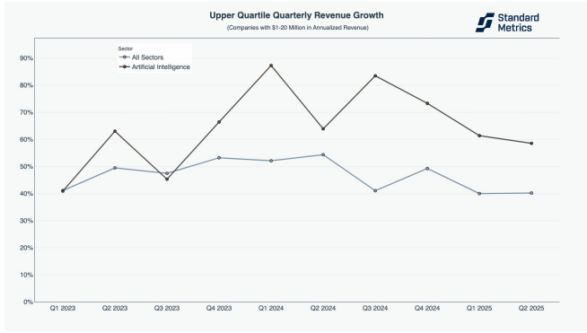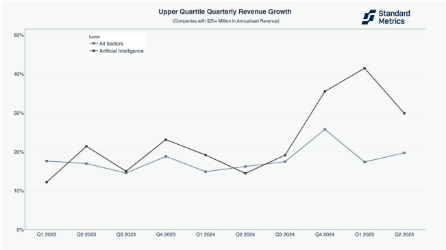 Standard Metrics 的数据指出,AI 公司的增长势头不仅限于初创阶段,在增长阶段同样也表现出色。无论是年收入处于 100 万至 2000 万美元区间的成长型 AI 公司,还是年收入超过 2000 万美元的成熟型 AI 公司,其增长表现自 2023 年第三季度以来均持续优于所有行业的平均水平。