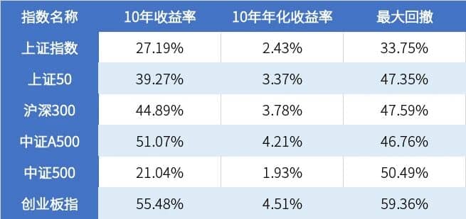 需要说明的是,这些指数的 10 年年化收益率都不高,即便是创业板指数,也只有 4.51%,和 10 年前刚性兑付的银行理财产品收益率差不多;而中证 500 指数的 10 年年化收益率不到 2%,还不如同期的定期存款利率高。希望未来 10 年,在投资与融资功能并重的股市新发展格局下,A 股投资收益率偏低的情况能够得到显著改善。