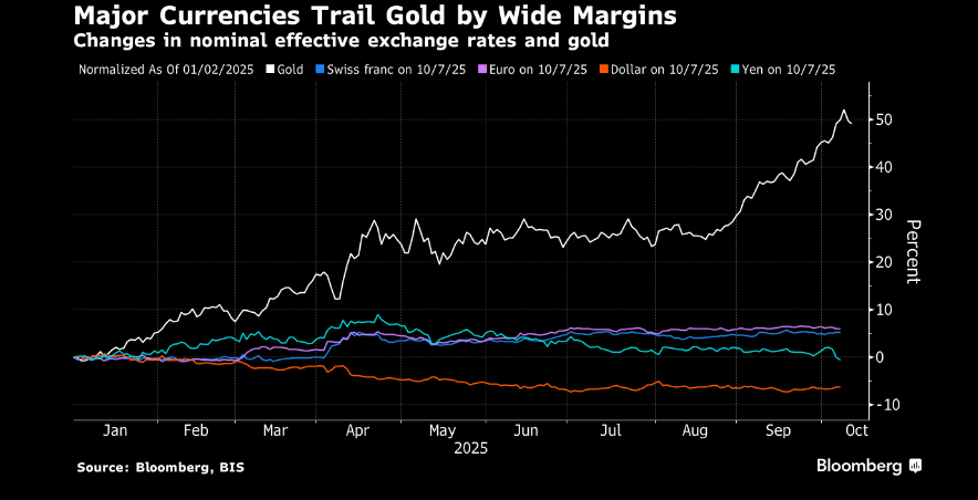 美元方面,尽管最近几周有所上涨且暂未受政府停摆影响,但今年以来仍累计走低。特朗普的贸易战及早期减税计划此前已将美元推入 1970 年代初以来最深跌势。其 「美国优先」 政策对全球秩序的冲击及对美联储独立性的攻击,引发了市场对美债是否能继续保持其作为世界主要无风险资产地位的质疑。