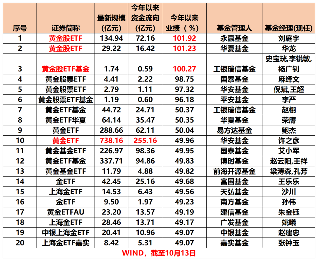 业绩方面,截至 10 月 13 日,黄金主题 ETF 年内单位净值增长率均为正,平均值为 64.55%。