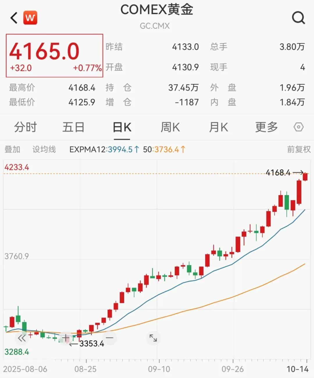 10 月 14 日盘中,国际金价持续拉升,截至发稿,伦敦现货黄金价格站上 4140 美元/盎司,COMEX 黄金期货价格站上 4160 美元/盎司,续刷历史新高。