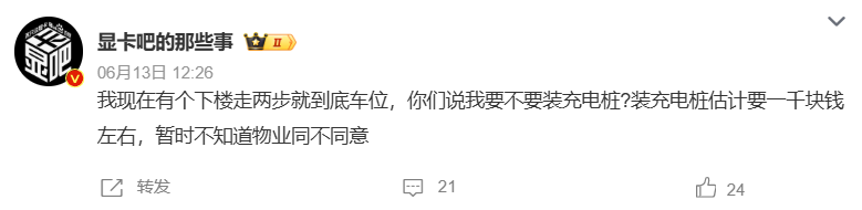 深圳福田的车友阿李就是其中之一,去年他拍着胸脯订了台新能源车,还豪掷八万准备装私人充电桩,心想着能和环境一起绿起来,结果物业一句 「安全隐患」,直接让他绿不动。