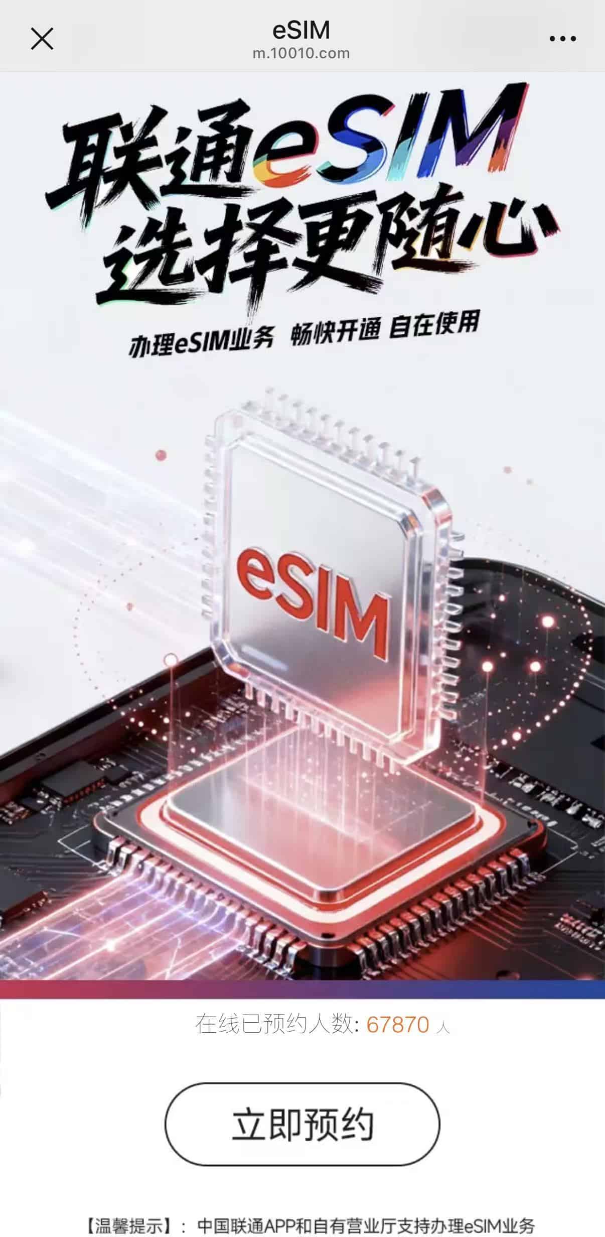 中国联通 eSIM 手机业务获批 线上预约已经超 6 万人