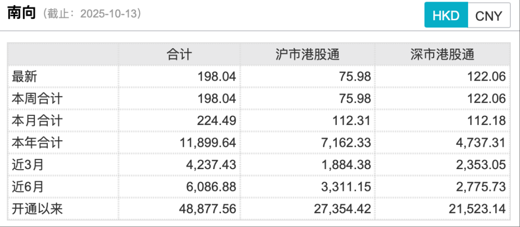 值得注意的是,尽管指数波动显著,但南向资金逢低大举买入港股,全天净买入港股达 198.04 亿港元,创下 8 月 5 日以来南向资金最大净买入规模。