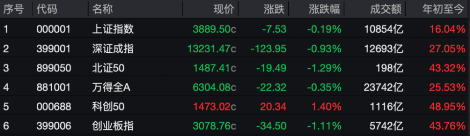 最终,截至 10 月 13 日收盘,上证综指微跌 0.19%,报 3889.5 点;科创 50 指数涨 1.4%,报 1473.02 点;深证成指跌 0.93%,报 13231.47 点;创业板指跌 1.11%,报 3078.76 点。